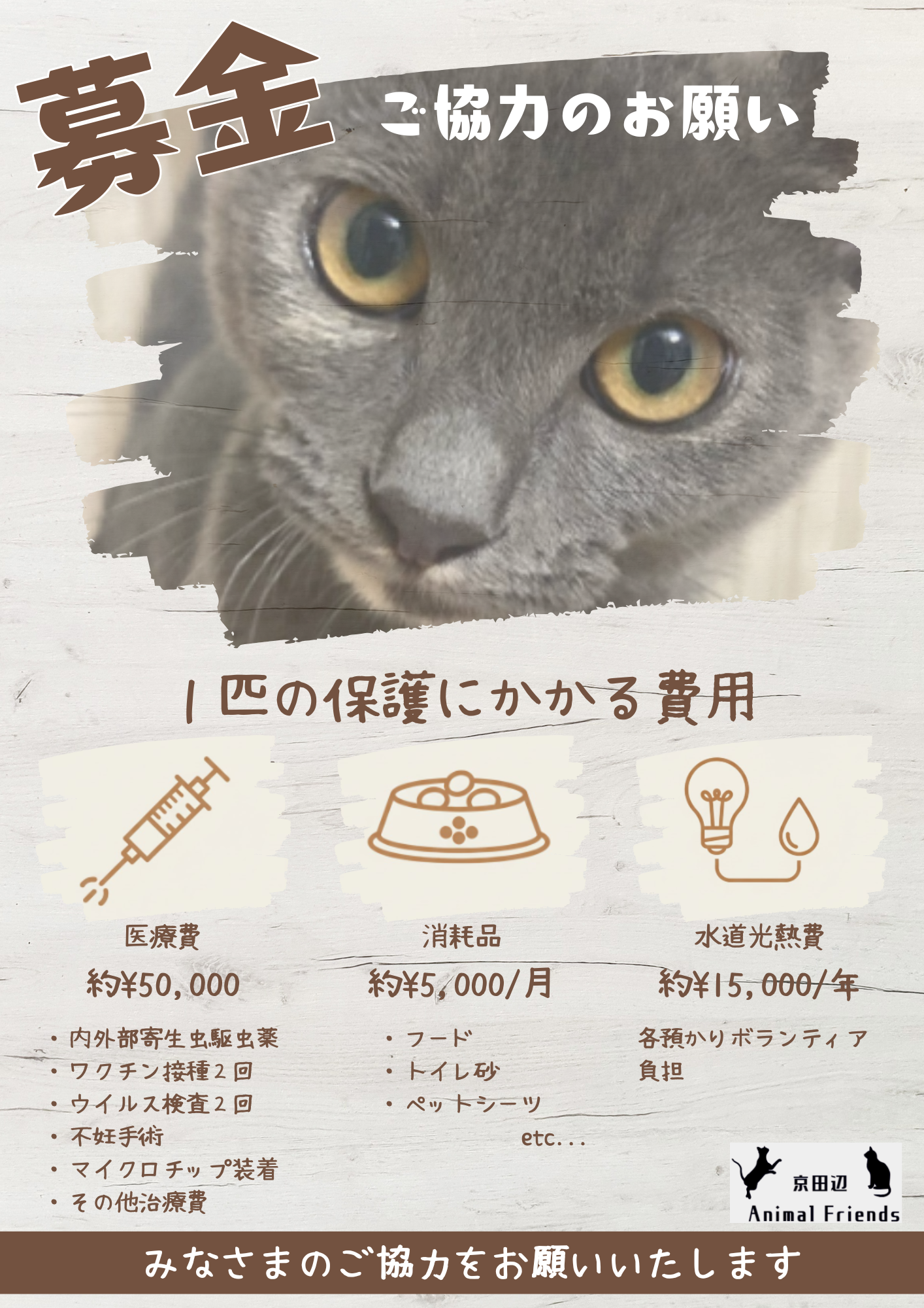 手術費、保護猫の医療費が嵩んでいます。どうかご無理のない範囲で温かいご支援のご協力を何卒よろしくお願い申し上げます。